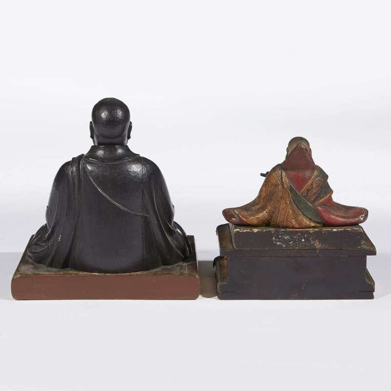 One seated in a dragon-bordered hooded robe, holding an item in each hand, on a metal-mounted gilt lacquer stand; the other seated, grasping rosary beads in both hands, fixed on a lacquer-painted platform.