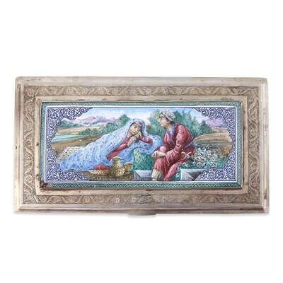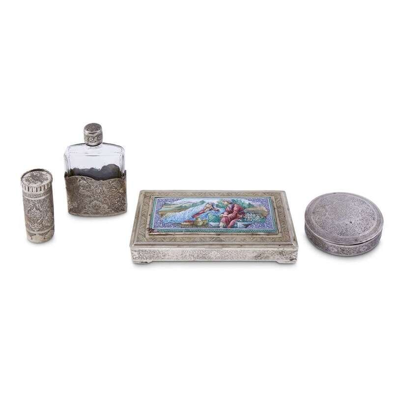 Comprising, an eastern round box and cover, apparently unmarked, the whole with engraved foliate decoration in formal roundel; a matching cylindrical box and cover, pull off cover; a white metal box and cover, Egyptian marks, the rectangular hinged cover with inset domed enamel on copper of two figures at leisure, scrolling spandrel detail, the body and border of cover with chased scrolling decorative floral design; a glass spirt flask with white metal sleeve, unmarked, of plain form, engraved screw off cover, the sleeve well engraved and cased with scrolling foliage.