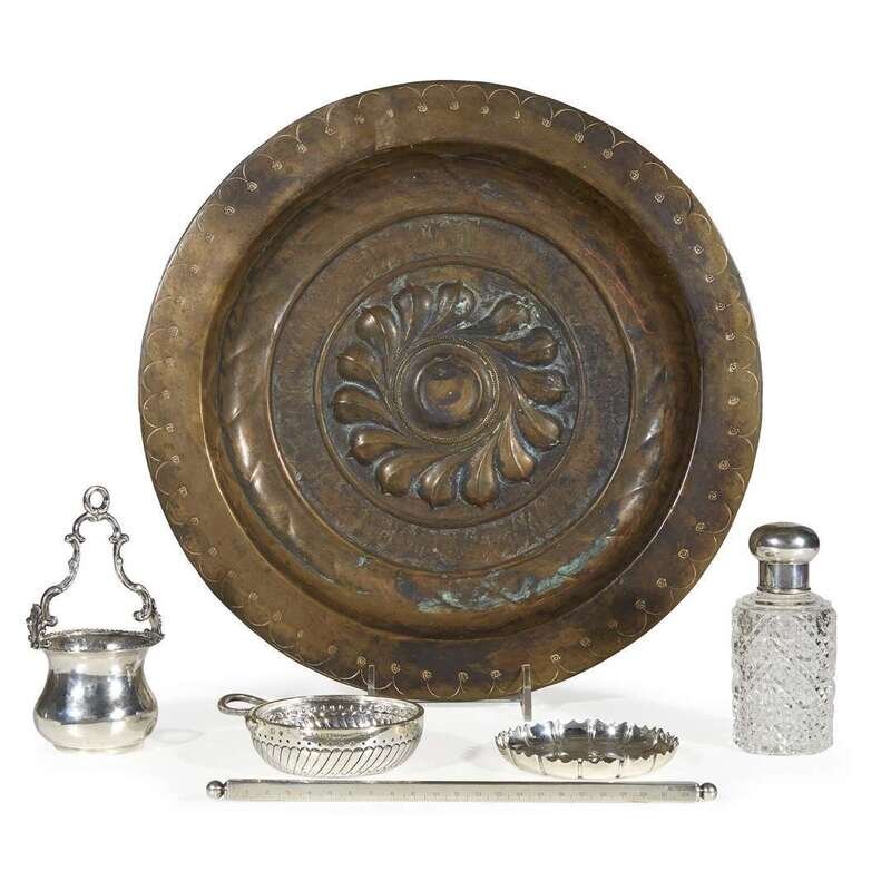 Comprising a silver ruler, a silver tastevin, a silver-mounted crystal scent bottle, a miniature hanging silver vase, a silver-plated coin-set ashtray; sold together with a brass dish. (6).
