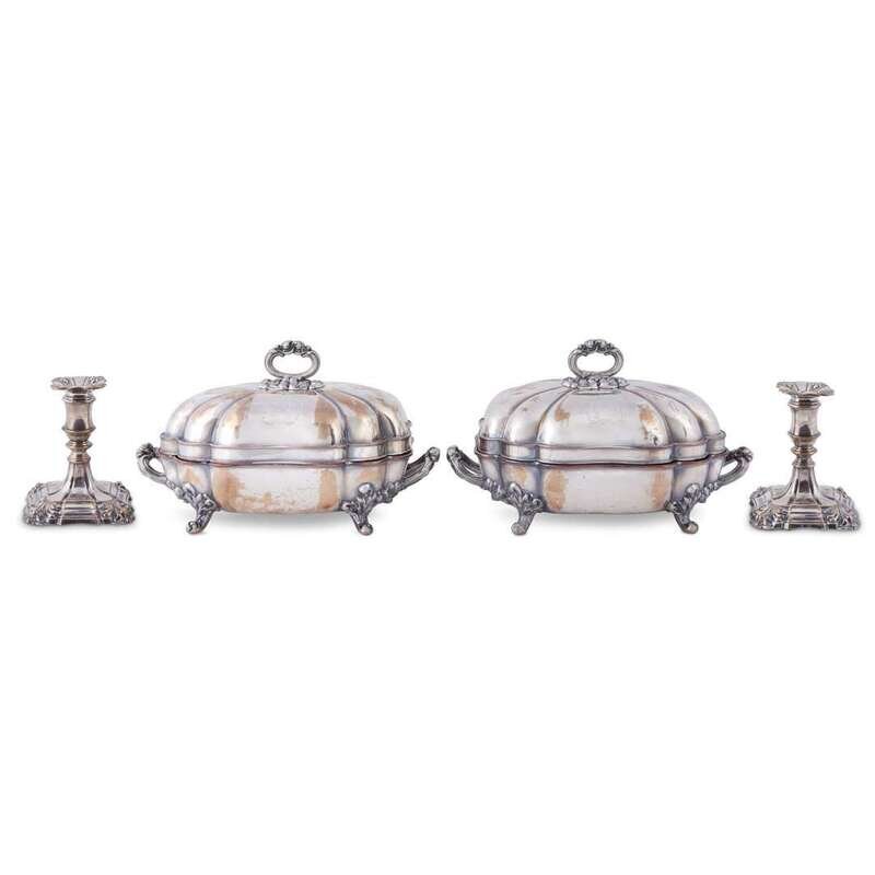 Marked two stars for Matthew Boulton, of lobed rectangular form, cast removable handles, the covers with engraved initials and armorials, the base with leaf clasped handles and scroll feet, together with a pair of low desk candlesticks also by Boulton. (4).
