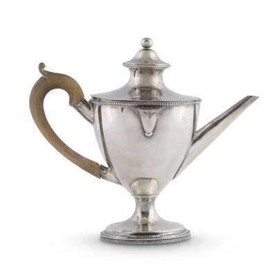 of small size, the pull off cover with round finial, beaded upper border, the vase shaped body with gadroon rim, straight tapering spout, wood handle, slender foot, spreading base with a further beaded border.