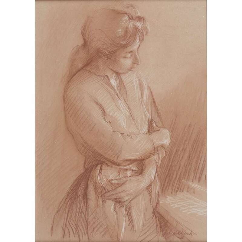 Signed and dated 63 bottom right, red and white conte crayon on paper.