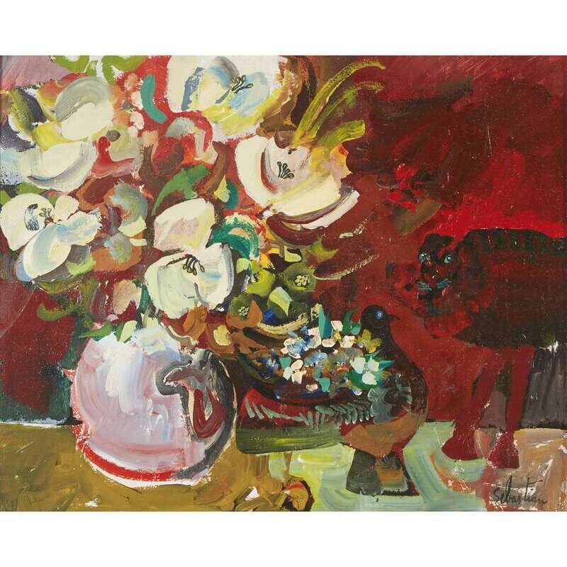 GERARD SEBASTIAN (SPANISH 1930–1996) STILL LIFE WITH FLOWERS AND CAT