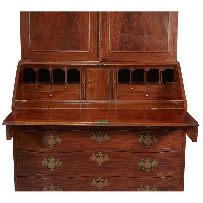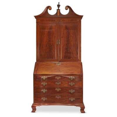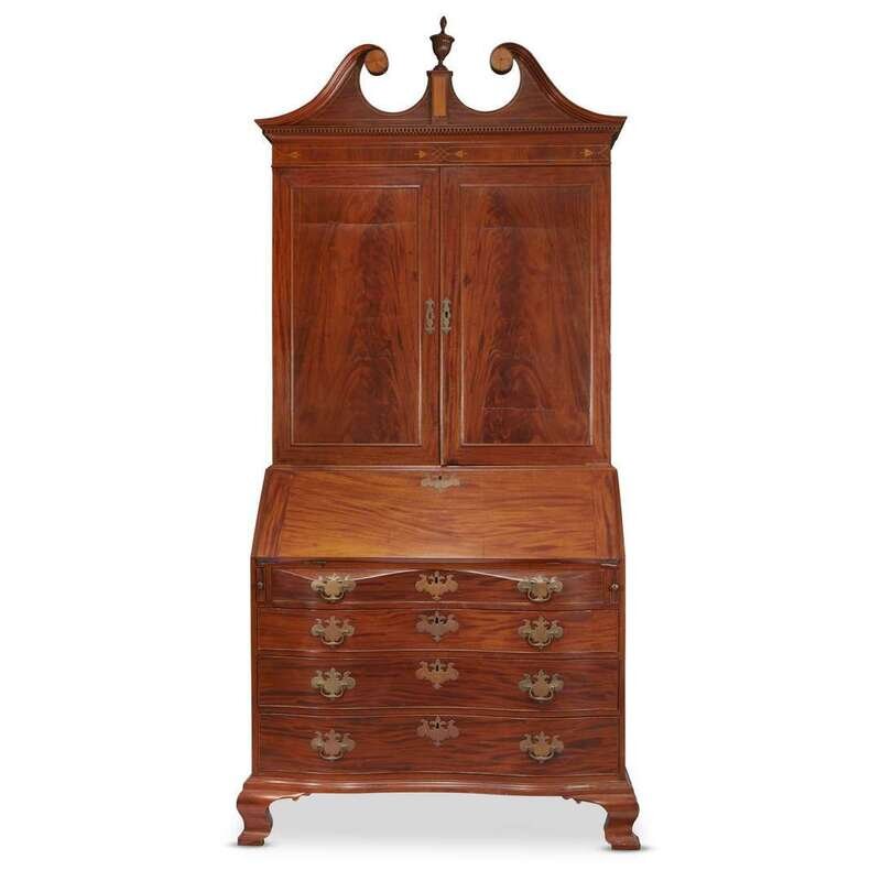In two parts, the upper case with swan's neck pediment with inlaid pinwheels centering a carved urn and flame finial, above bellflower and line inlaid frieze, and two doors opening to fitted interior, the lower case with slant lid opening to fitted interior above oxbow facade and drawers, ogival bracket feet.
