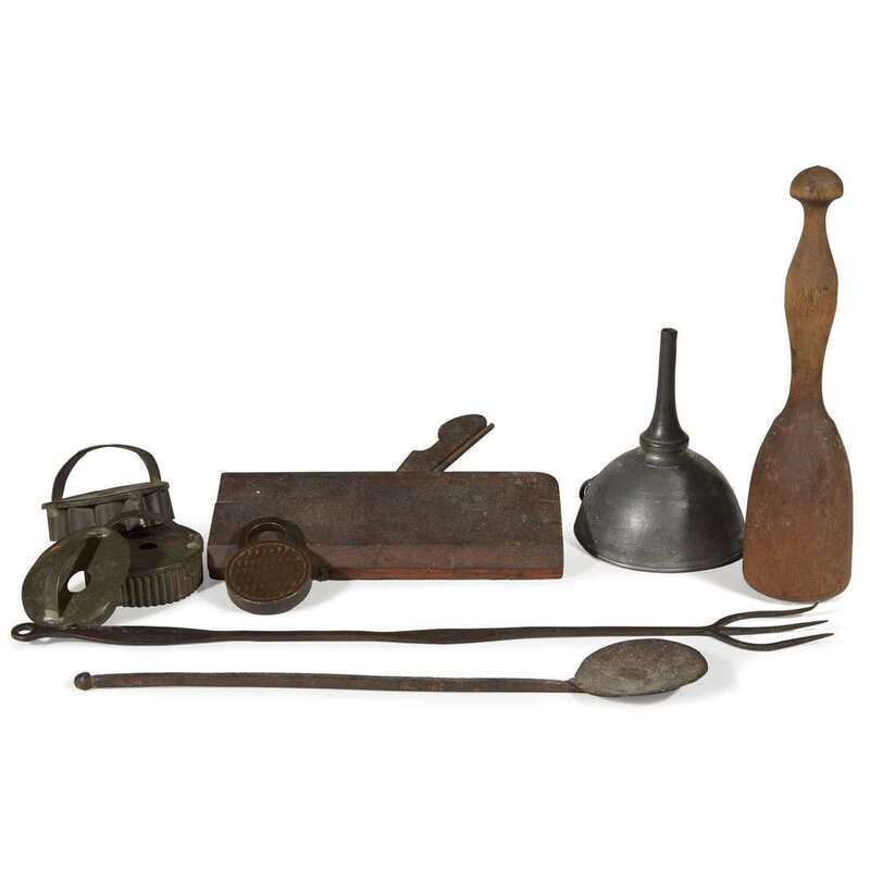 Comprising a wrought iron serving spoon, fork, three tin cookie cutters, pewter funnel, iron lock, cabinetmaker's plane, and wood pin. (9).
