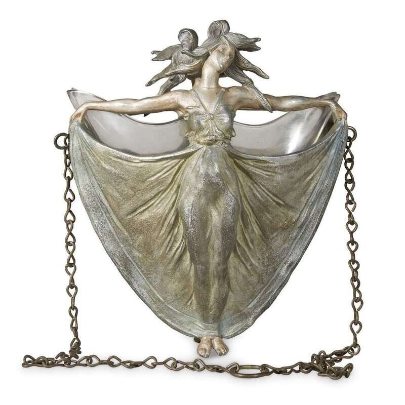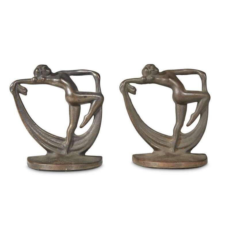 An assembled group of three pairs of mixed metal bookends and an Art Nouveau figural mixed metal and glass hanging vase 20th century