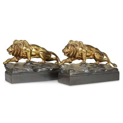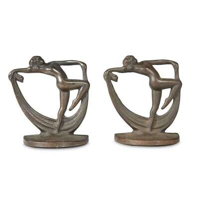 Comprising three pairs of bookends: kneeling Native Americans, dancers, and lions; the hanging vase depicting draped ladies. (7).