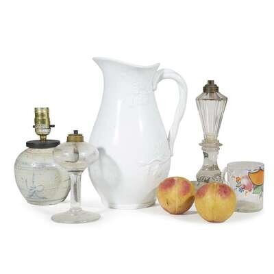 Comprising English ironstone-style pitcher, Canton jar mounted as lamp, two glass oil lamps, a enamel-painted glass mug inscribed "Forget Me Not", and two painted marble peaches. (7).
