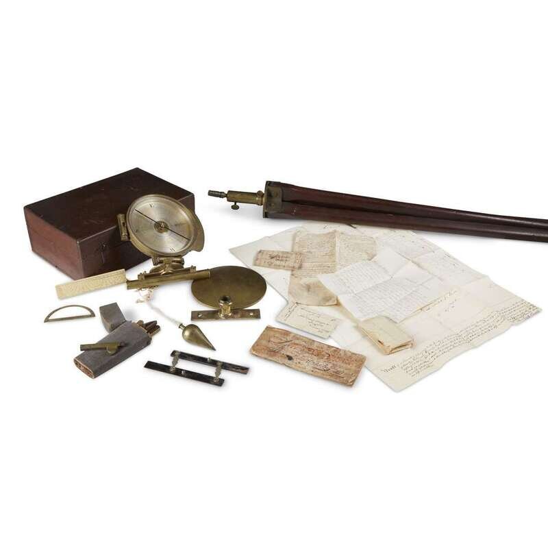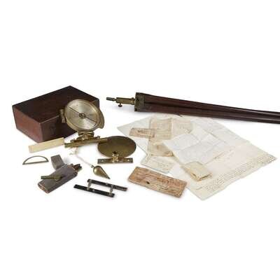 Compass engraved, "Stancliffe Maker-Philada Warranted," with a fitted wooden box, plumb bob, one brass tool engraved, "H. Gregory London," and a shagreen case fitted with tools; together with an account book of Joel Evans from 1817, several surveyor's maps, and correspondence concerning surveying.