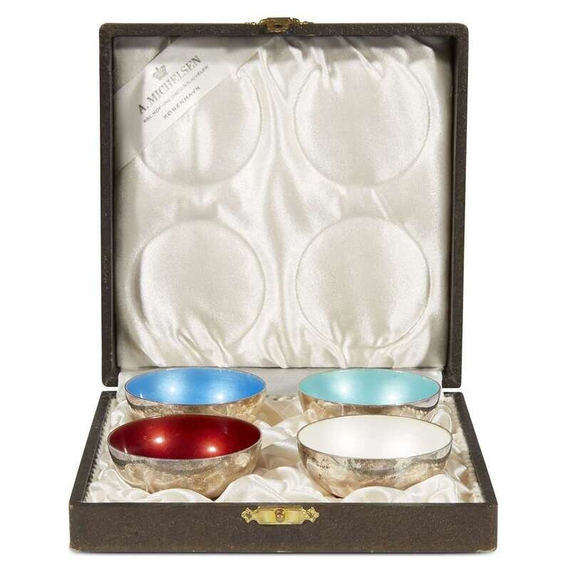 Of plain conical form, green/blue enamel interior, pressed out foot; together with a cased set of four small silver and enamel bowls, of plain form, slight spreading ring foot. (3).