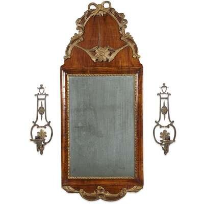 Together with a pair of Neoclassical style parcel gilt wrought iron lyre-form candle sconces. (3).
