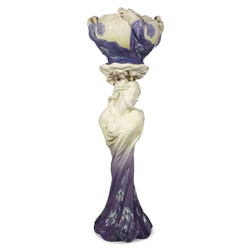 The stand depicting a lady draped in a purple garment decorated with irises, the jardinière with ladies in conforming drapery; the underside of stand and jardinière inscribed, "Delphin Massier/Vallauris (A.M.)"