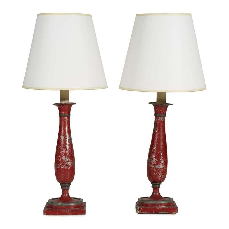 A pair of French tôle peinte candlesticks fitted as lamps 19th century