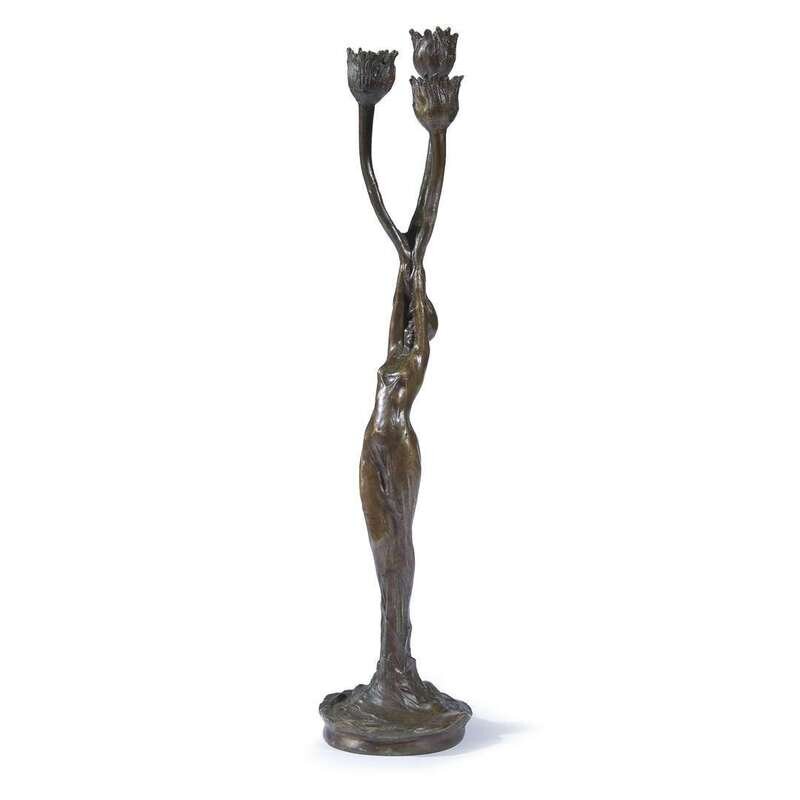 An Art Nouveau bronze three-light candelabrum after Firmin Bate, circa 1900