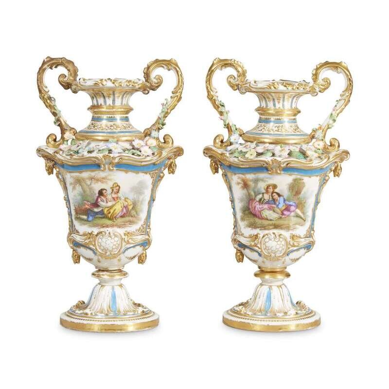 A pair of Louis Philippe/Napoleon III parcel-gilt and hand painted porcelain vases mid-19th century