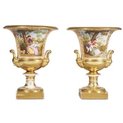 A pair of Paris porcelain parcel-gilt and hand-painted campana-form urns mid 19th century