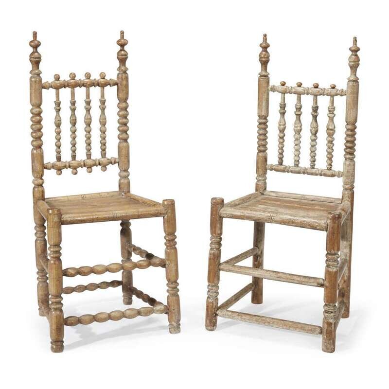 With turned stiles, bannisters, legs, and stretchers; plank seats.