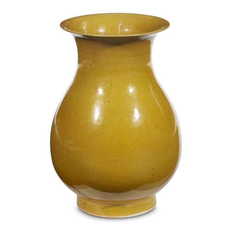 Vasiform, with flared lip and slightly spreading foot, covered with a deep yellow glaze.