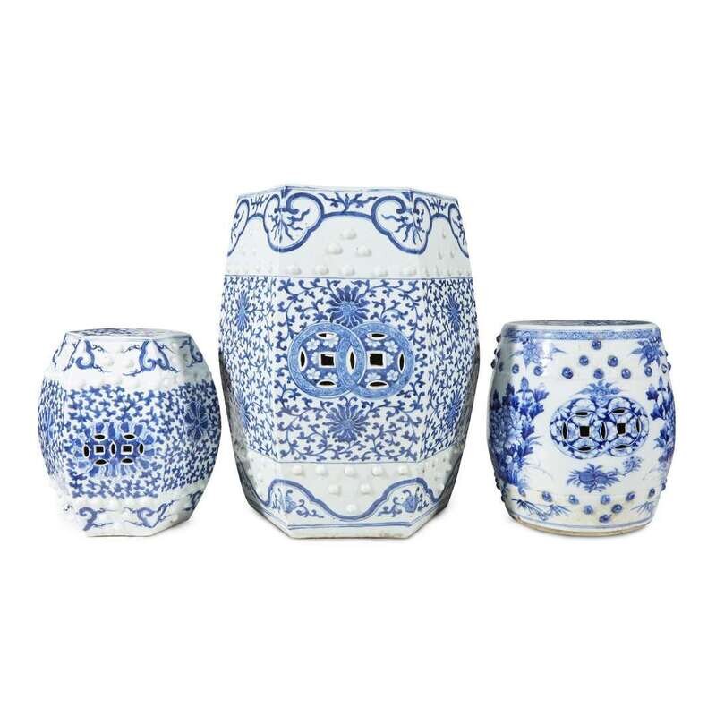 Two hexagonal stools and one barrel-form stool, all with raised studded patterns.