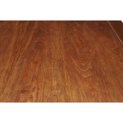 The rectangular top with inset panel, raised on rounded legs with scroll spandrels, two stretcher bars on each end.