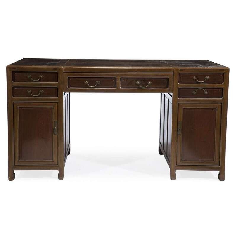 A Chinese double pedestal desk with associated footrests