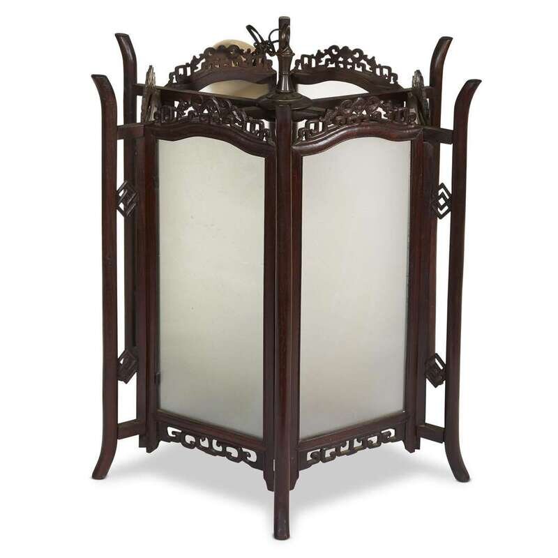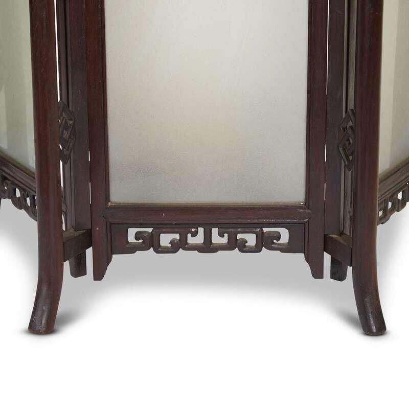 A Chinese carved hardwood and frosted glass hexagonal hanging lantern