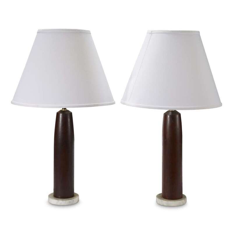 Style of Jane and Gordon Martz A pair of teak wood and white marble table lamps, circa 1960s