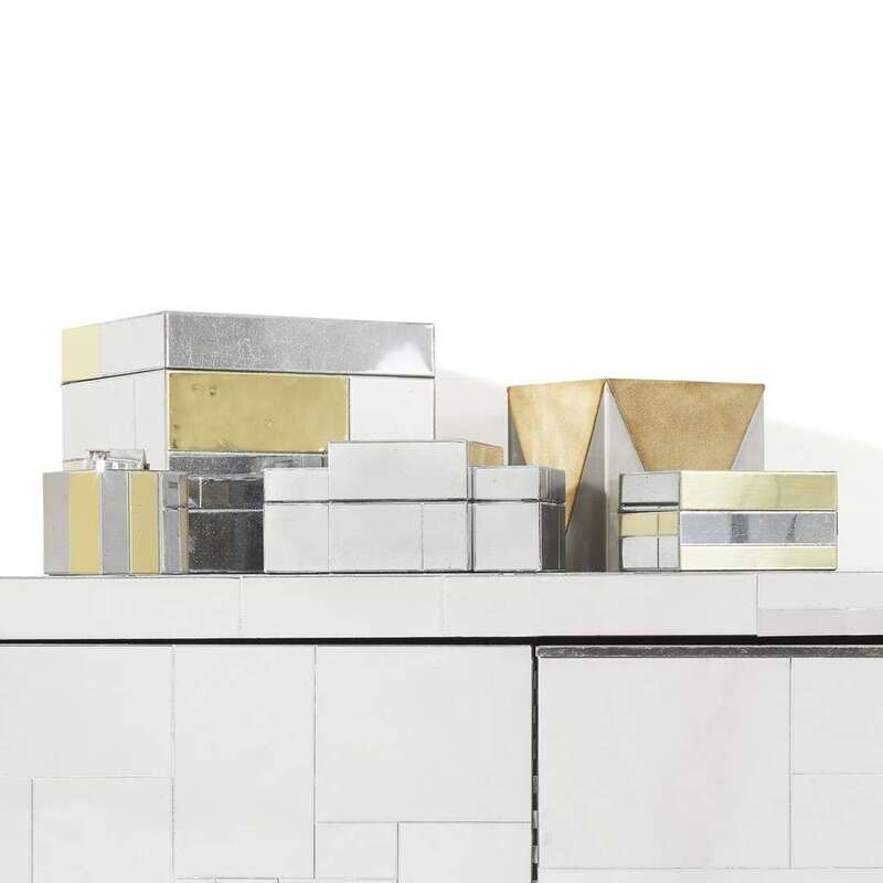 NEW HOPE, PENNSYLVANIA, CIRCA 1970 Including ice bucket, lighter, ashtray, and two boxes Chrome, brass, stainless steel, suede.