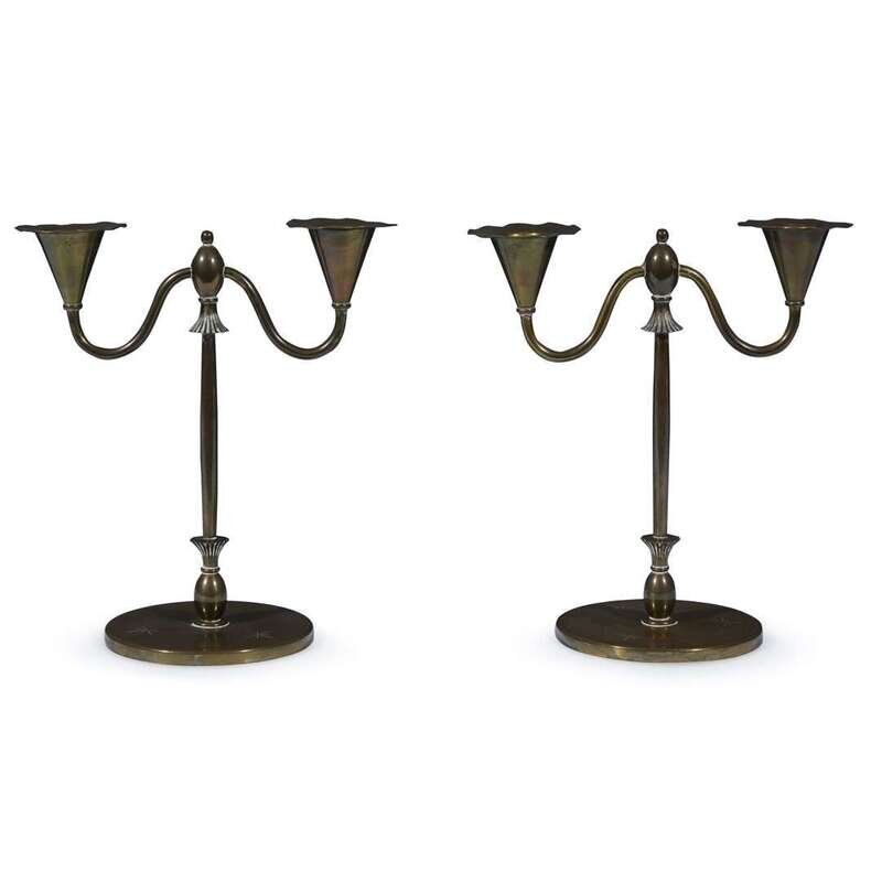 A pair of Swedish brass two-light candelabra O.H. Lagerstedt, Eskiltuna, first half 20th century