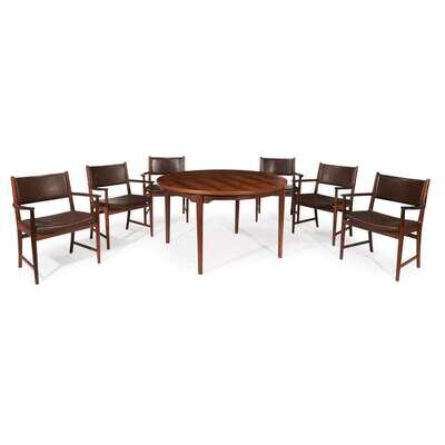 The table designed by Torbjørn Afdal for Bruksbo, Norway with single table leaf. The chairs in leather designed by Kai Lyngfeldt-larsen for Søren Willadsen, Denmark.