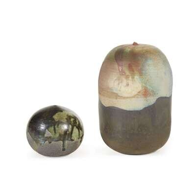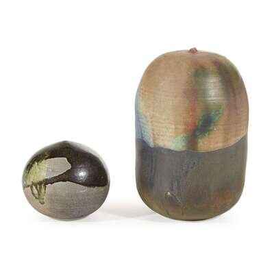 Of ovoid form with a partial olive green glaze, burgundy, blues and greens. Incised TT Together with: A small spherical vessel in the manner of Takaezu with a partial olive green and black glaze, apparently unmarked.