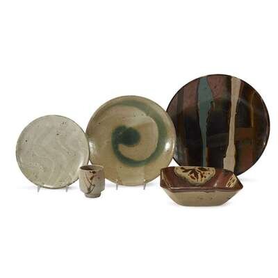 Including three round chargers including one in the style of Shoji Hamada, a square bowl, and a teacup (yunomi) attributed to Shoji Hamada. (5).