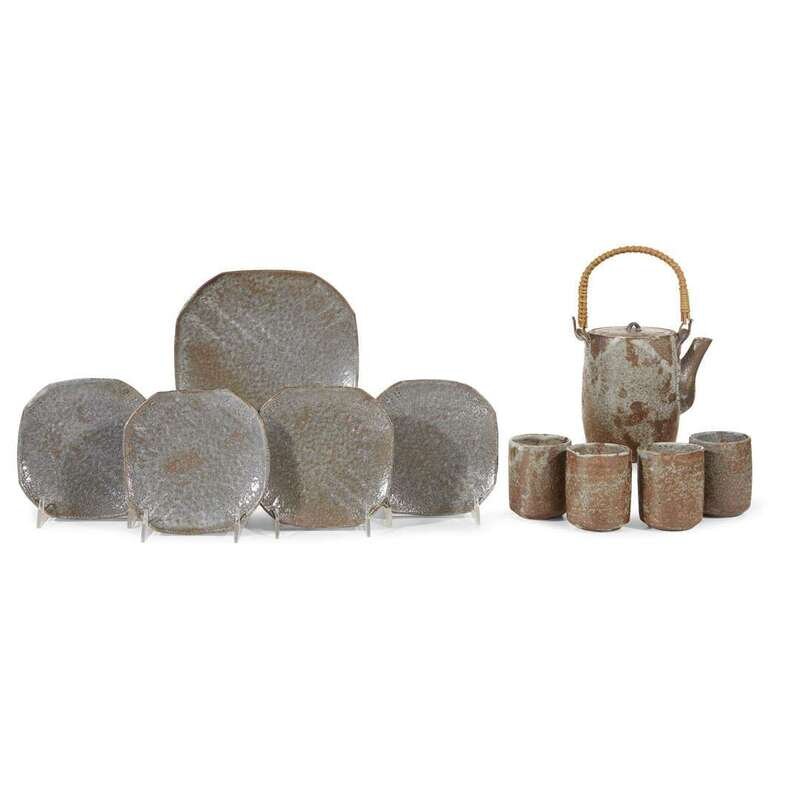 Comprising teapot, four small plates, one large plate and four cups. Teapot marked.