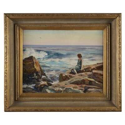 HOWARD RUSSELL BUTLER (AMERICAN, 1856-1934) "MAINE COAST, GIRL ON ROCKS WATCHING SPRAY"