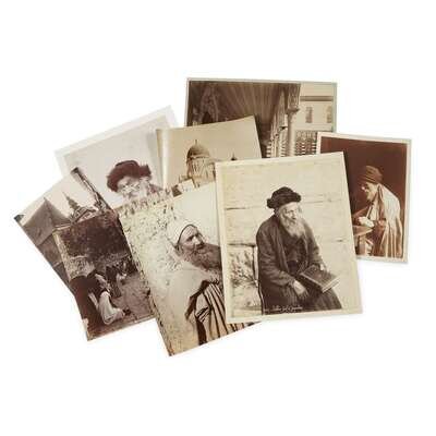 Ten photographs of Jewish men and landmarks, taken by various photo studios including Lehnert et Landrock and Bonfils. Subjects include the Jewish Town Hall in Prague, a Jewish banker in Tunisia, and a rabbi in Jerusalem.