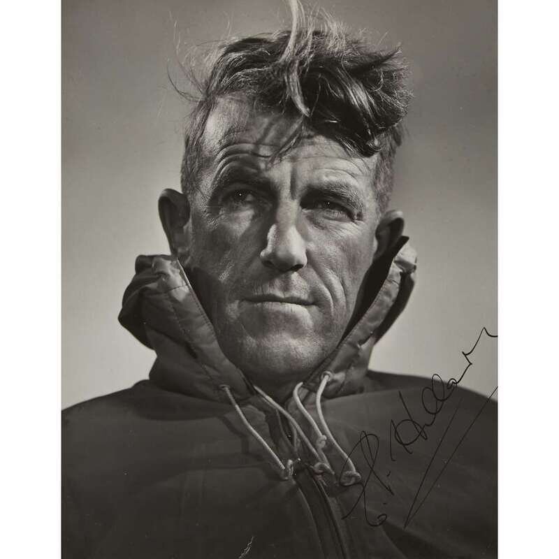 Ottawa, 1960. Signed by Hillary in black pen on recto; Karsh copyright stamp on verso; small fissure to bottom; small surface abrasions. Gelatin silver print.