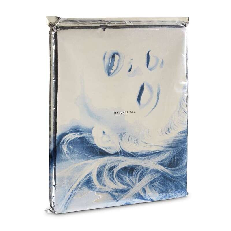 Warner Books, (1992). First edition. Folio. Photographs by Steven Meisel. Metallic spiral spine over brushed aluminum "boards." Original printed unopened Mylar bag and CD, also in its own unopened printed Mylar sleeve.