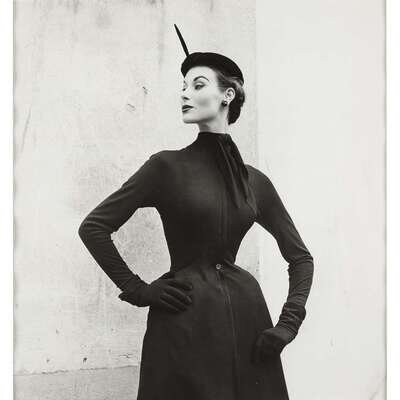 1952. Gelatin silver print. Signed by McLaughlin-Gill and inscribed,"'Dior Black' photographed for/Vogue Magazine August 1952/Paris collections." by her in pencil on verso; Staley-Wise gallery sticker on bottom right.