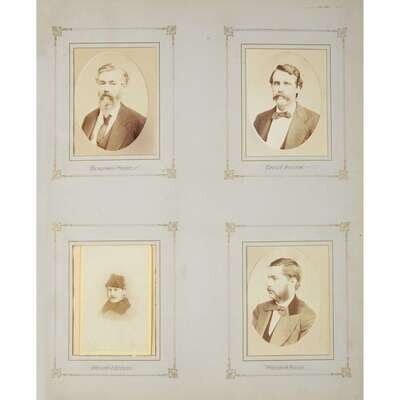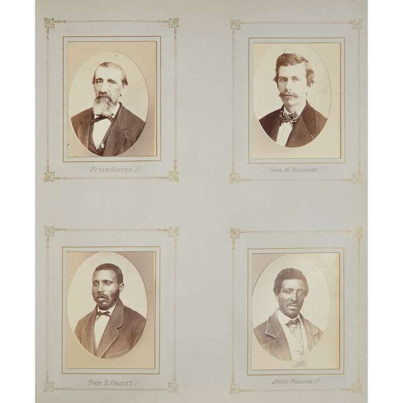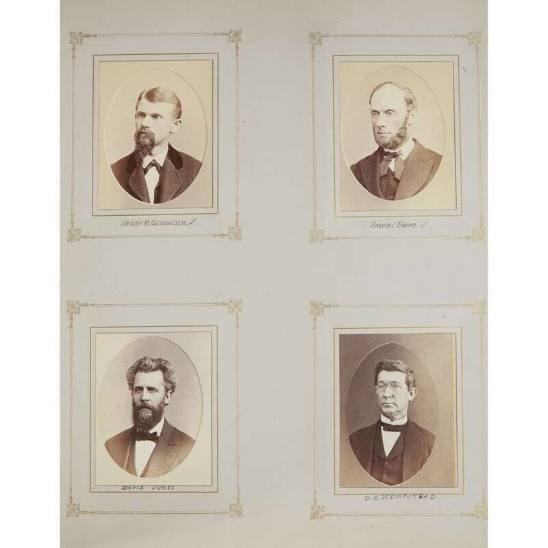 Philadelphia, March, 1871. Folio. Featuring a mounted manuscript page of resolutions adopted by officers of the House; one mounted albumen print of the original Philadelphia Custom House; one mounted albumen portrait likely of Collector of Customs Henry D. Moore; 223 window mounted carte de visites of officers and employees of the Custom House, each measuring 5 x 3 in., and with their names in manuscript below each; Contemporary brown leather over heavy boards, worn and rubbed, front board detached; elaborately stamped in gilt; metal claps; gauffered edges in gilt; gilt dentelles; moiré silk endpapers. Ex-library with book-plate on front paste-down, mounted barcode and ink stamp on front free endpaper, and ink stamp under large mounted photograph. Sold with all faults.