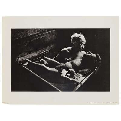 (Tokyo: Seibu Department Store), (1973). Folio. Signed by Smith in blue ink on front cover. Illustrated with 12 reproductions of photographs by Smith. Photo-pictorial wrappers; contents loose as issued. Portfolio worn; old mold residue on front panel; dampstaining along right edge; spine ends torn.Two plates with dampstaining to left edge; one plate with crease to bottom corner; other light wear.