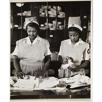Photograph depicting two African-American nurses during their training course at Freedman's Hospital in Washington, D.C. Taken for the Office of War Information.