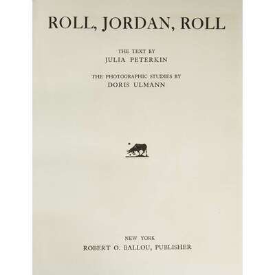 New York: Robert O. Ballou, (1933). First deluxe edition, one of 350 copies signed by Ulmann and Peterkin on limitation page, this copy out of series. Illustrated with 90 hand-pulled photogravure plates by Ulmann; lacking the additional laid in photogravure plate signed by her; lacking all but two of the tissue guards. Publisher's three-quarter white cloth over brown paper-covered boards, lightly worn, white cloth soiled and slightly darkened, boards slightly faded; front cover with debossed image of an African-American woman, back cover with publisher's device stamped in gilt; spine lettered in gilt; top edge gilt, other edges untrimmed; slip case wanting; previous owner's note in pencil on front free endpaper: "Compliments of the author & Dr. Holland."