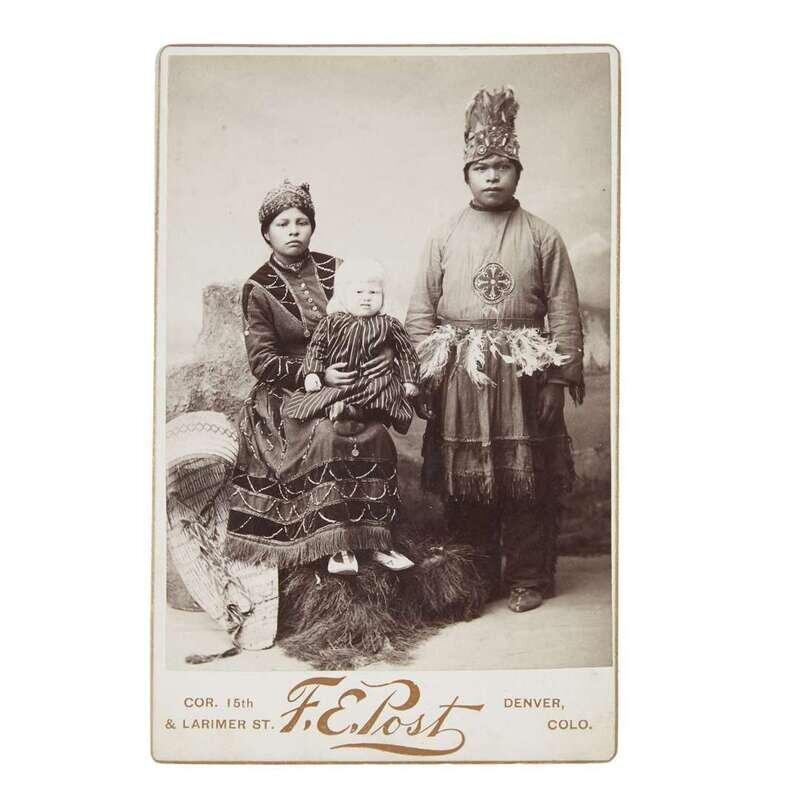 Cabinet card from F.E. Post, Denver, Colorado. Photograph depicts what appears to be a young Native American couple with an albino child.