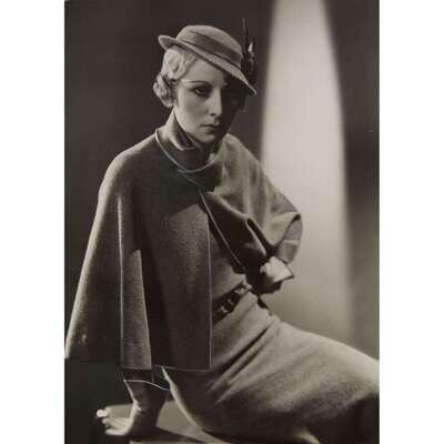 1933. Gelatin silver print. Photographer's stamp, various ink and pencil annotations, and typed description: "A mole grey ensemble by MOLYNEUX in one of the new hairy woolens. The hat is made of the same fabric. (exclusive).", on verso. With faint white and black paint lines emphasizing certain lines of the image—edge of cape, eyebrows, hatband, etc.