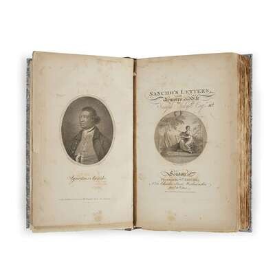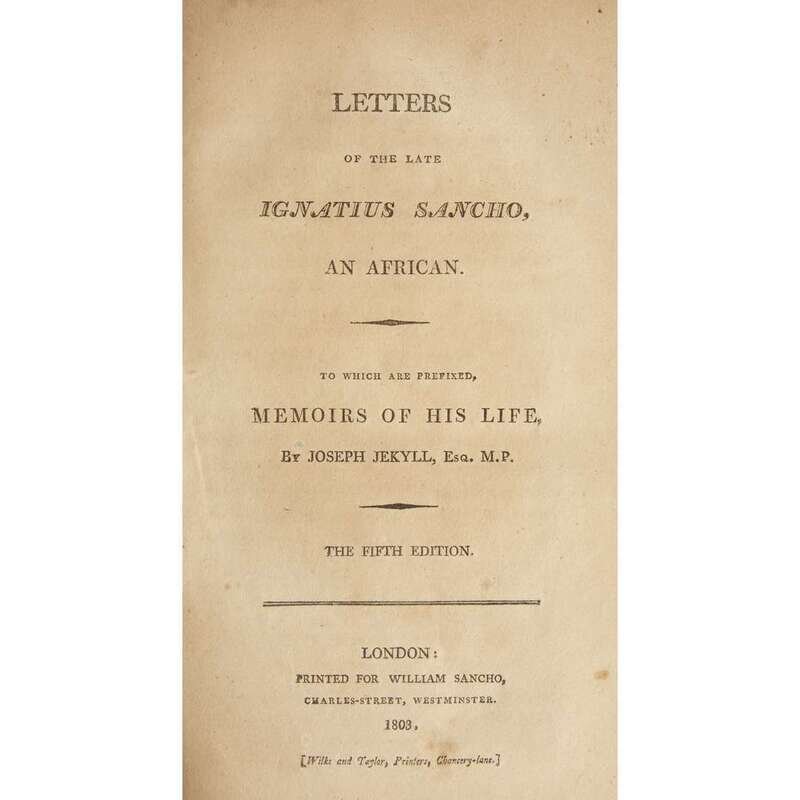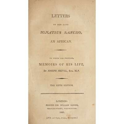 London: for William Sancho by [Wilks and Taylor], 1803. "The Fifth Edition," first one volume edition. 8vo. [iv], (i)-xvi, (1)-310pp., plus frontispiece, additional engraved title-page, folding facsimile letter; complete with half-title. Modern quarter calf over marbled boards. Illustrated with engraved frontispiece portrait of Sancho by Francesco Bartolozzi after Thomas Gainsborough, an additional engraved title-page by Bartolozzi, engraved facsimile letter from Laurence Sterne to Sancho. Lightly toned, scattered, generally light spotting, light to moderate foxing to frontispiece and additional engraved title-page, minor dampstaining to upper blank margins, scattered small marginal tears, repaired tears to facsimile letter, some pencilled marginalia. Blockson 263; OCLC 15314805; see Sabin 76310.