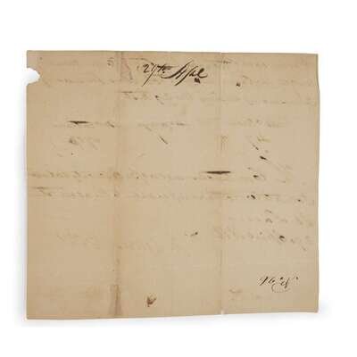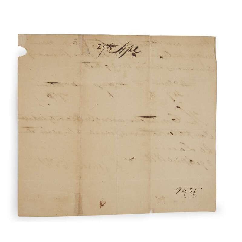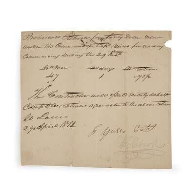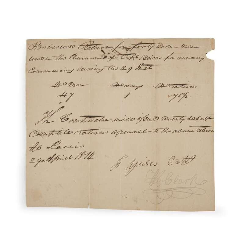 St. Louis: April 29, 1814. 1pp. Autograph document in ink to recto of one trimmed sheet of laid paper, signed in pencil: "Wm Clark". Near fine with creases and a few tears to extremities, some letters heavily inked. Recto, in full: "Provisions Return for forty seven men / under the command of Capt Yeiser for one day / commencing + ending the 29th. / No men 47 No days 1 No rations 70 1/2 / The contractor will issue seventy + a half / complete rations agreeable to the above return. / St. Louis / 29 April 1814 / F Yeiser Capt / Wm Clark". Verso marked with "No 26" and "29 April".