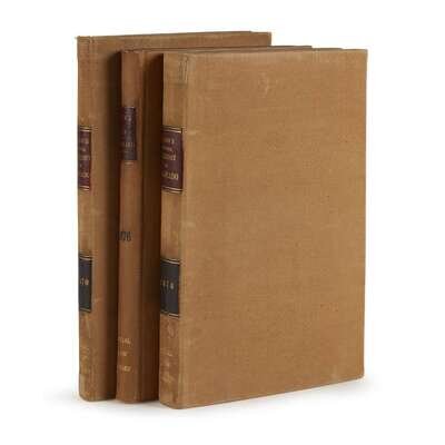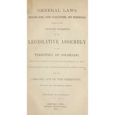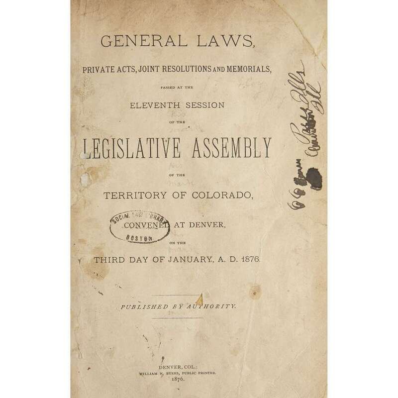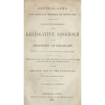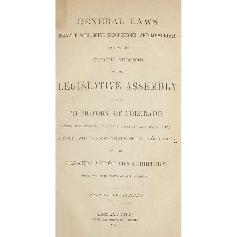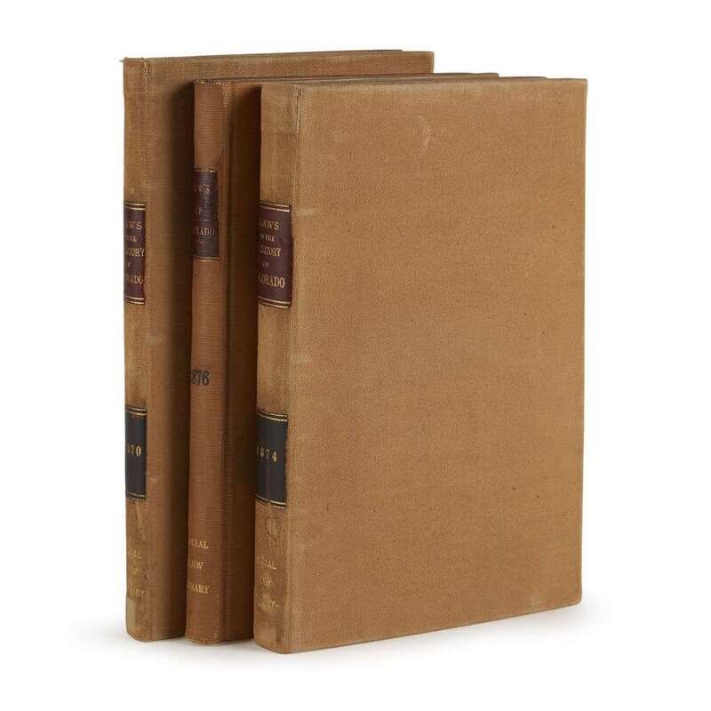 General Laws. Joint Resolutions, Memorials, and Private Acts, passed at the Eighth Session of the Legislative Assembly of the Territory of Colorado...1870. Together with the Declaration of Independence, the Constitution of the United States, and the Organic Act of the Territory... Central City: David C. Collier, 1870. 8vo. (1)-180, (2)pp. 20th century tan buckram, lightly worn; morocco spine labels. Scattered soiling; small paper faults at back. Ex-library with label on front paste-down amd ink stamp on front free endpaper recto. General Laws, Private Acts, Joint Resolutions, and Memorials, passed at the Tenth Session of the Legislative Assembly of the Territory of Colorado,...1874. Together with the Constitution of the United States... Central City, 1874. 8vo. (1)-347(1)pp. 20th century buckram, lightly worn; morocco spine labels. Title-page lightly toned, repaired at top margin; errata slip at back. Ex-library with label on front paste-down and ink stamp on front free endpaper recto. General Law, Private Acts, Joint Resolutions and Memorials, passed at the Eleventh Session of the Legislative Assembly of the Territory of Colorado...1876 Denver: William N. Byers, 1876. 8vo. (1)-223(1)pp. 20th century tan buckram, lightly worn. Title-page toned, creased, and repaired. A few annotations and ownership signatures in ink; last leaf repaired. Ex-library with label on front paste-down and ink stamp on title-page.