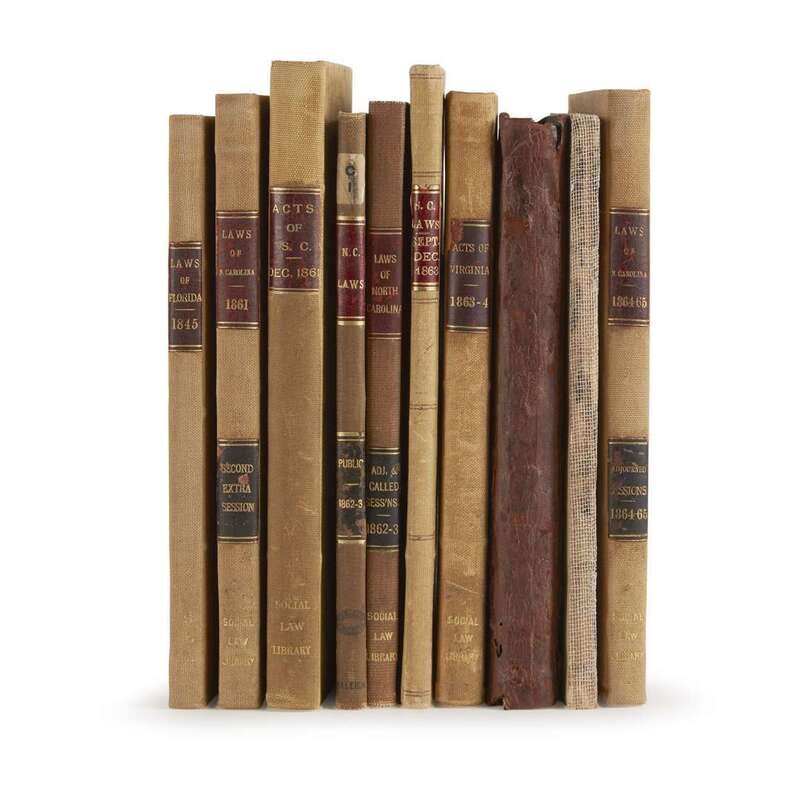 Acts of the Called Session of the General Assembly of Alabama, Held in the City of Montgomery, commencing on the Second Monday in January, 1861 Montgomery: Shorter & Reid, 1861. 8vo. (1)-161, (1)pp. Modern boards, separated but present, lacking spine. Parrish and Willingham 2620. Acts of the Second Called Session, 1861 and of the First Regular Annual Session of the General Assembly of Alabama...in November, 1861 Montgomery: Montgomery Advertiser Book and Job Office, 1862. 8vo. (1)-303 (1)pp. Quarter contemporary calf-over blue paper boards, worn and blistered. Front hinge startin; darkening to endpapers; discoloration to title-page gutter; lightly toned; ownership signatures in ink. Ex-library with ink stamp at head of front free endpaper recto. Parrish and Willingham 2621. Private Laws of the State of North-Carolina, passed by the General Assembly at its Adjourned Session of 1862-63 Raleigh: W.W. Holden, 1863. 8vo. (1)-84, [2], (i)-iv, and supplied leaf. 20th century brown buckram; morocco spine label. Last index leaf, pp.v(vi) supplied in 20th century type script; lightly toned; scattered light foxing. Parrish and Willingham 3495. Bound with: Private Laws of the State of North-Carolina, passed by the General Assembly at its Called Session of 1863. Raleigh: W.W. Holden, 1863. 8vo. (1)-13(1)pp., and index leaf. Scattered light foxing and dampstaining. Ex-library with label on front paste-down and scattered ink and perforated stamps. Parrish & Willingham 3495; 3497. Public Laws of the State of North-Carolina, passed by the General Assembly, at its Second Extra Session, 1861 Raleigh: John Spelman, 1861. 8vo. (1)-140, (i)-iii(iv)pp. 20th century tan buckram; morocco spine label. Scattered discoloration and dampstaining; ownership signature at head of title-page. Ex-library with label on front paste-down and ink stamp on front free endpaper recto. Parrish & Willingham 3501. Public Laws of the State of North-Carolina, passed by the General Assembly, at its Session of 1862-'63: Together with the Comptroller's Statement of Public Revenue and Expenditure Raleigh: W.W. Holden, 1863. 8vo. (1)-54,(i)-iv pp. 20th century tan buckram; morocco spine label. Lightly toned; scattered light foxing; ownership signature on title-page. Ex-library with label on front paste-down and scattered ink stamps. Parrish & Willingham 3502. Public Laws of the State of North-Carolina, Passed by the General Assembly at itsAdjorned Session of 1864 Raleigh: W.W. Holden, 1864. 8vo. (1)-31(2), (i)-iv pp. 20th century tan buckram, lightly worn; morocco spine label; trimmed. Bound with: Public Laws of the State of North-Carolina, passed by the General Assembly, at its Regular Session of 1864-'65. Raleigh: Cannon & Holden, 1865. 8vo. (1)-80, (i)-iii pp. Scattered light dampstaining. (Not a Confederate imprint). And Bound with: Public Laws of the State of North-Carolina, passed by the General Assembly of 1865. Raleigh: Wm. K Pell, 1866. 8vo. (1)-12, (i)-ii pp. Minor dampstaining. (Not a Confederate imprint). And bound with: Pub Laws of the State of North-Carolina, passed by the General Assembly, at its Adjourned Session of 1865. Raleigh: Cannon & Holden, 1865. 8vo. (1)-42, (i)-iii pp. Minor dampstaining. (Not a Confederate imprint). Ex-library. Parrish and Willingham 3506. Acts of the General Assembly of the State of South Carolina, passed in December, 1861 Columbia: Charles P. Pelham, 1862. 8vo. (i)-v, (3), (1)-88, (2), (i)- xiv pp. 20th century tan buckram, edges sunned; morocco spine label. ; with original printed green front wrapper, detached and slightly discolored. Ex-library with label on front paste-down and ink stamp on title-page. Parrish and Willingham 3830. Acts of the General Assembly of the State of South Carolina, passed in September and December, 1863. Columbia: Charles P. Pelham, 1864. 8vo. (viii), 169-231, (1), (i)- xi pp. 20th century tan buckram, lightly worn; morocco spine label. Parrish and Willingham 3832. Acts of the General Assembly of the State of Virginia, passed at a called session, 1863... Richmond: William F. Ritchie, 1863. 8vo. (1)-57 pp. 20th century tan buckram; morocco spine label, spine lightly sunned; early ownership signature in ink on front blank. Bound with: Acts of the General Assembly of the State of Virginia, passed at the session of 1863-4...Richmond: William F. Ritchie, 1864. 8vo. (1)-107. Scattered foxing. Also bound with: Acts of the General Assembly of the State of Virginia, Passed at the Regular Session, Commencing December 7th 1863...Alexandria: 'State Journal' Print, 1864. 8vo. (1)-39pp. Original green wrappers. (Not a Confederate imprint). Ex-library with label on front paste-down and scattered ink stamps. Parrish and Willingham 4390; 4391. The Acts and Resolutions, passed by the Legislative Council, of the Territory of Florida, at the Twenty-third Session...January 6, 1845 Tallahassee: W. & C. J. Bartlett, 1845. 8vo. (1)-107(1), (i)-iv pp. 20th century tan buckram. Light dampstaining and foxing. Ex-library with label on front paste-down and scattered ink stamps.