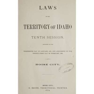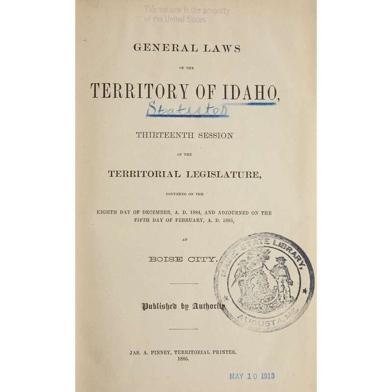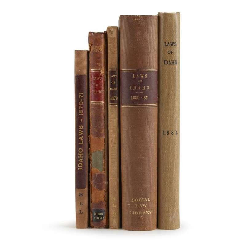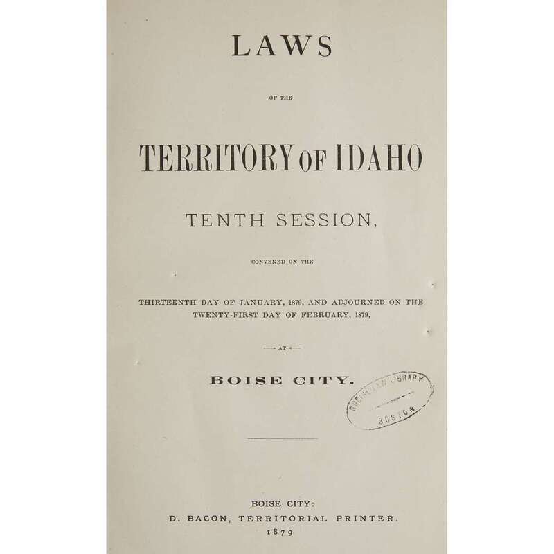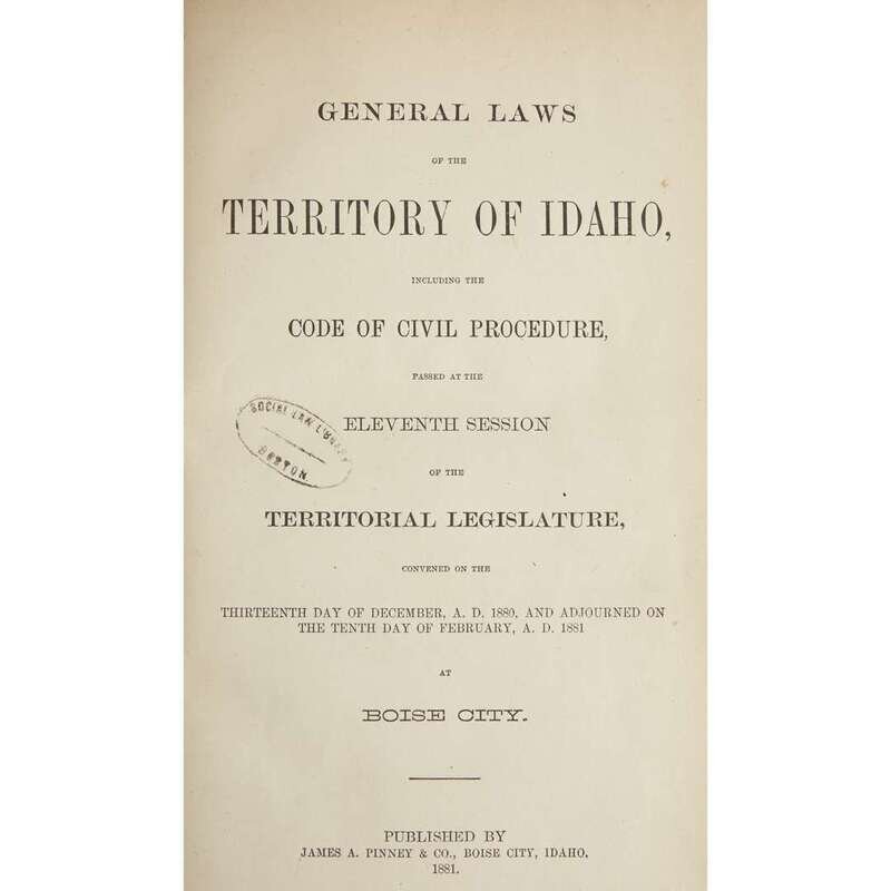 Laws and Resolutions, passed by the Sixth Legislative Assembly of the Territory of Idaho...1870...1871 Boise City: James S. Reynolds, 1871. 12mo. (1)-101pp. 20th century tan buckram; morocco spine label; all edges trimmed. Title-page gutter repaired with "Bar Association" ownership signature in ink. Ex-library with label on front paste-down and scattered ink stamps. Laws of the Territory of Idaho, Ninth Session...1876...1877 Boise City: Milton Kelley, 1877. 8vo. (iv), (1)-144pp. Early 20th century sheep, front cover detached but present, spine rubbed, back joint starting; morocco spine labels. Bound with: Laws of the Territory of Idaho.Tenth Session…Boise City: D. Bacon, 1879. 8vo. (1)-92pp. Ex-library with label on front paste-down and scattered ink stamps. Laws of the Territory of Idaho. Tenth Session...1879 Boise City: D. Bacon, 1879. 8vo. (1)-92pp. 20th century tan buckram, lightly worn; morocco spine label. Ex-library with label on front paste-down and scattered ink stamps. General Laws of the Territory of Idaho, including the Code of Civil Procedure, passed at the Eleventh Session of the Territorial Legislature...1880...1881 Boise City: James A. Pinney, 1881. 8vo. (iv), (1)-564pp. 20th century tan buckram, lightly worn; morocco spine label. Ex-library with label on front paste-down and scattered ink stamps. General Laws of the Territory of Idaho, Thirteenth Session of the Territorial Legislature...1884...1885 (Boise City): Jas. A. Pinney, 1885. 8vo. (iv), (1)-241pp. 20th century tan buckram, lightly worn. Ex-library with ink stamps on title-page.