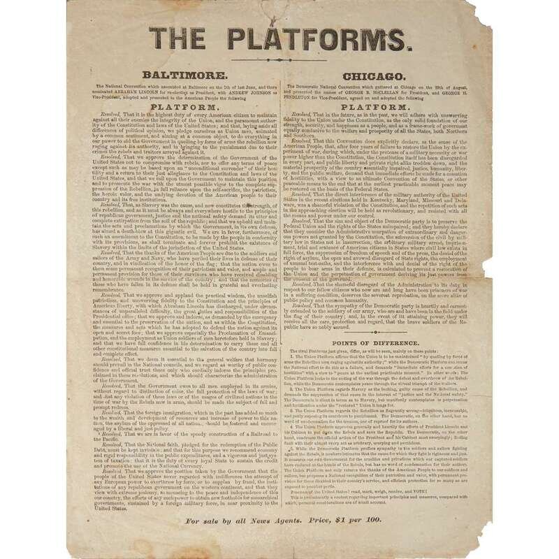 No place, 1864. Broadside outlining the political views and public records of vice-presidential candidates George H. Pendleton and Andrew Johnson. "The Platforms [of the Republican and Democratic Parties, at Baltimore and Chicago. n.p. 1864]" Sabin 63348.